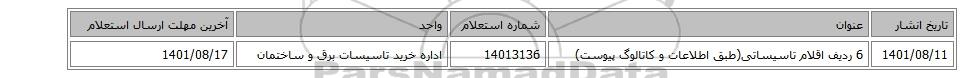 | 1401/08/11 | 6 ردیف اقلام تاسیساتی(طبق اطلاعات و کاتالوگ پیوست) | 14013136 | اداره خرید تاسیسات برق و ساختمان | 1401/08/17 |
