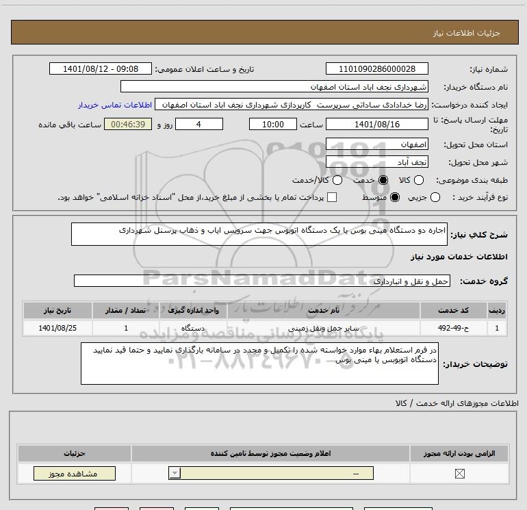 شرح کلی نیاز: اجاره دو دستگاه مینی بوس یا یک دستگاه اتوبوس جهت سرویس ایاب و ذهاب پرسنل شهرداری