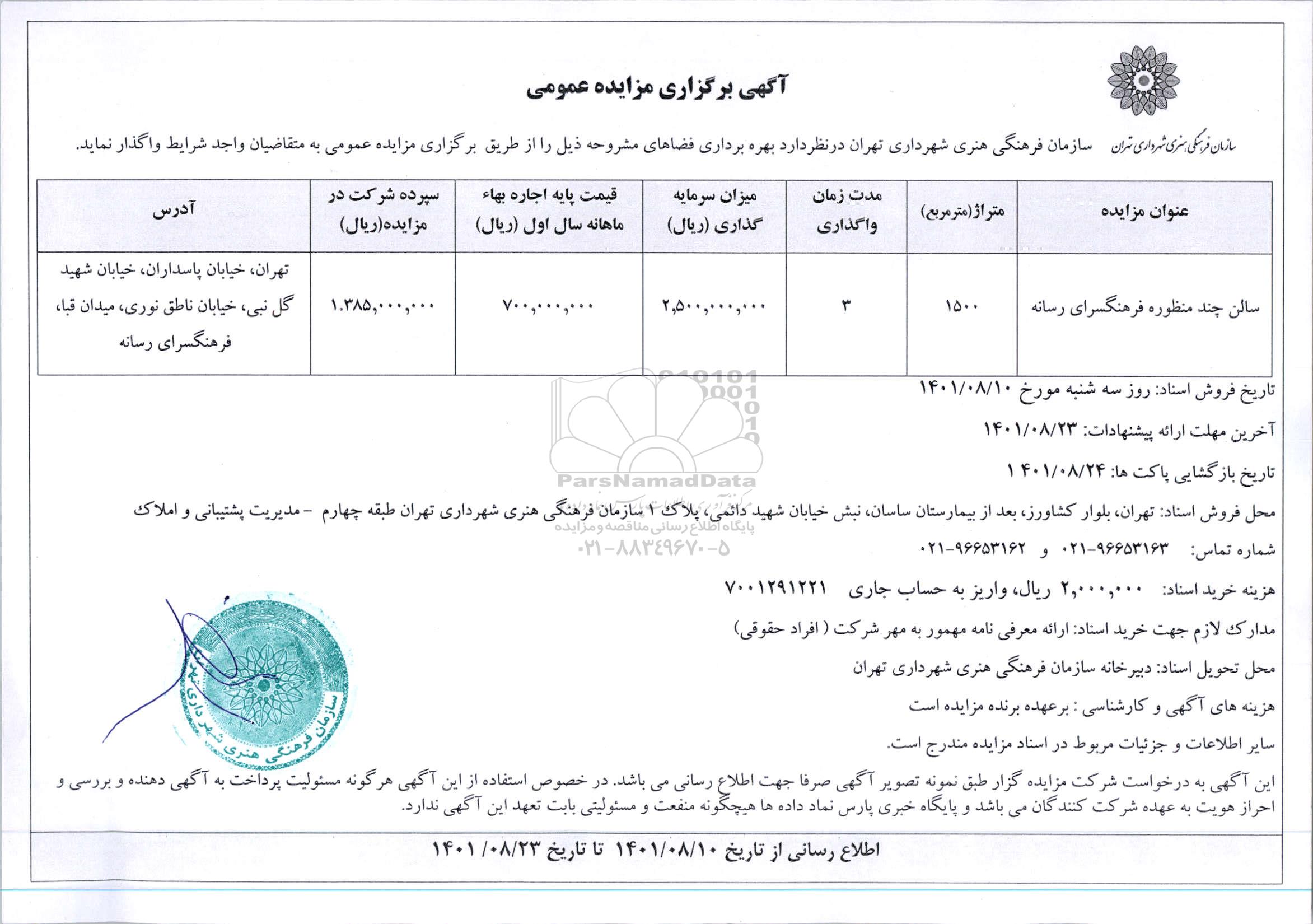 سازمان فرهنگی هنری شهرداری تهران در نظر دارد بهره برداری فضاهای مشروحه ذیل را از طریق مزایده عمومی به متقاضیان واجد شرایط واگذار نماید.