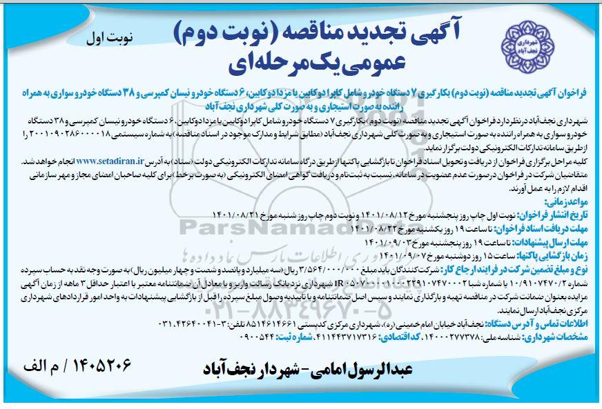 شهرداری نجف آباد در نظر دارد فراخوان آگهی تجدید مناقصه (نوبت دوم) بكارگیری 7 دستگاه خودرو شامل كاپرا دو كابین یا مزدا دو كابین ، 6 دستگاه خودرو نیسان كمپرسی و 38 دستگاه خودرو سواری به همراه راننده به صورت استیجاری و به صورت كلیشهرداری نجف آباد ( مطابق شرایط و مدارك موجود در اسناد مناقصه )به شمارهسیستمی 2001090286000018 را از طریق سامانه تداركات الكترونیكی دولت برگزار نماید.