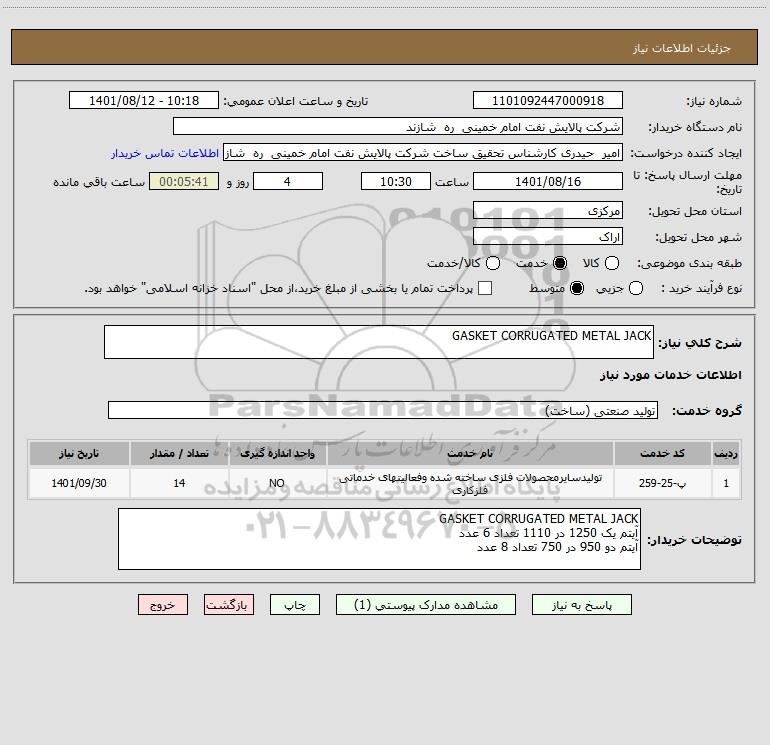 شرح کلی نیاز: GASKET CORRUGATED METAL JACK