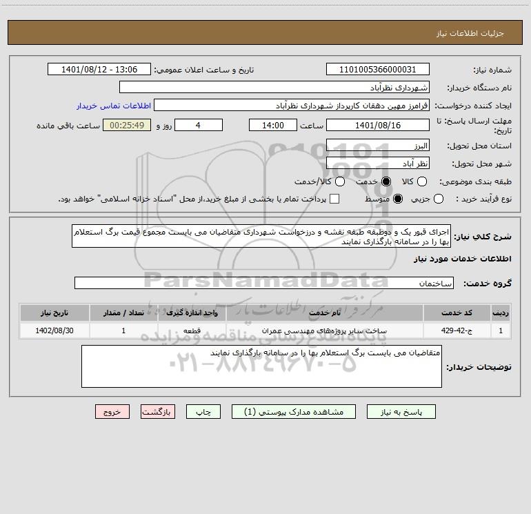 شرح کلی نیاز: اجرای قبور یک و دوطبقه طبقه نقشه و درزخواست شهرداری متقاضیان می بایست مجموع قیمت برگ استعلام بها را در سامانه بارگذاری نمایند