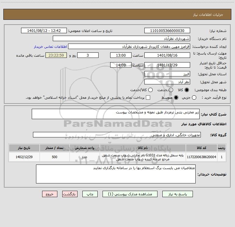 استعلام بها و موضوع استعلام استعلام زیر مخزنی بتنی ترمزدار طبق نمونه و مشخصات پیوست به اطلاع کلیه شرکتها و افراد متخصص واجد شرایط میرساند، آگهی گذار در نظر دارد از طریق استعلام بها، نسبت به انتخاب و دریافت پیشنهادات اقدام نماید. این استعلام با کد آگهی ثبت شده در سامانه خبرگزاری پارس نماد : 5103777 منتشر شده است. مشخصات استعلام : تاریخ شروع استعلام: 1401/08/12 آخرین مهلت ارسال پیشنهاد قیمت : 1401/08/16 و محل اجرای پروژه : استان البرز میباشد. استعلام قیمت مورد درخواست : استعلام زیر مخزنی بتنی ترمزدار طبق نمونه و مشخصات پیوست با دستهبندیهای تخصصی و گروه های مرتبط : تجهیزات پارک و مبلمان شهری, قطعات بتنی, استعلام اطلاع رسانی میگردد.