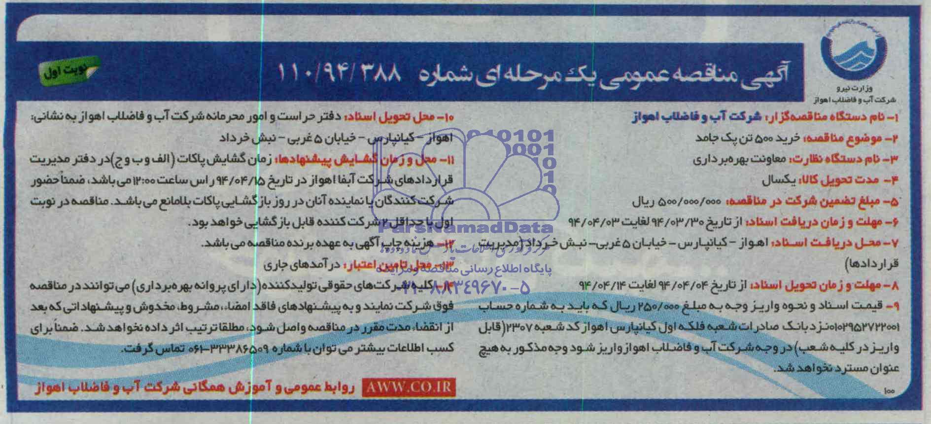 نام دستگاه مناقصه گزار: شرکت آب و فاضلاب اهواز