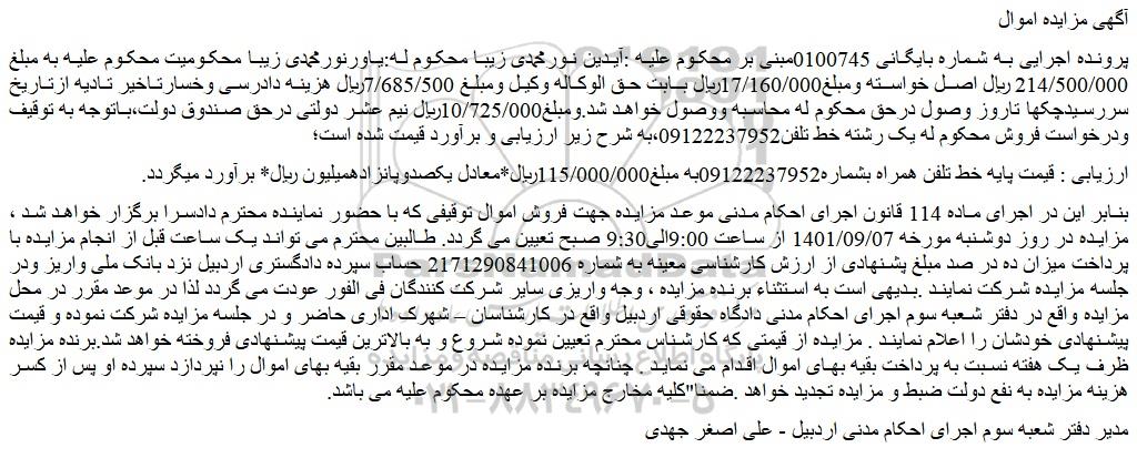 بنابر این در اجرای ماده 114 قانون اجرای احکام مدنی موعد مزایده جهت فروش اموال توقیفی که با حضور نماینده محترم دادسرا برگزار خواهد شد ، مزایده در روز دوشنبه مورخه 1401/09/07 از ساعت 9:00الی9:30 صبح تعیین می گردد. طالبین محترم می تواند یک ساعت قبل از انجام مزایده با پرداخت میزان ده در صد مبلغ پشنهادی از ارزش کارشناسی معینه به شماره 2171290841006 حساب سپرده دادگستری اردبیل نزد بانک ملی واریز ودر جلسه مزایده شرکت نمایند .بدیهی است به استثناء برنده مزایده ، وجه واریزی سایر شرکت کنندگان فی الفور عودت می گردد لذا در موعد مقرر در محل مزایده واقع در دفتر شعبه سوم اجرای احکام مدنی دادگاه حقوقی اردبیل واقع در کارشناسان – شهرک اداری حاضر و در جلسه مزایده شرکت نموده و قیمت پیشنهادی خودشان را اعلام نمایند . مزایده از قیمتی که کارشناس محترم تعیین نموده شروع و به بالاترین قیمت پیشنهادی فروخته خواهد شد.برنده مزایده ظرف یک هفته نسبت به پرداخت بقیه بهای اموال اقدام می نماید . چنانچه برنده مزایده در موعد مقرر بقیه بهای اموال را نپردازد سپرده او پس از کسر هزینه مزایده به نفع دولت ضبط و مزایده تجدید خواهد .ضمنا"کلیه مخارج مزایده بر عهده محکوم علیه می باشد