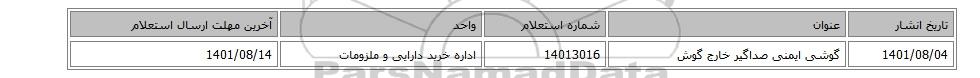 | 1401/08/04 | گوشی ایمنی صداگیر خارج گوش | 14013016 | اداره خرید دارایی و ملزومات | 1401/08/14 |