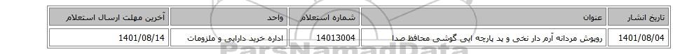 | 1401/08/04 | روپوش مردانه آرم دار نخی و پد پارچه ایی گوشی محافظ صدا | 14013004 | اداره خرید دارایی و ملزومات | 1401/08/14 |