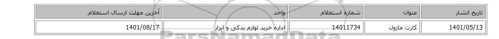 | 1401/05/13 | کارت ماژول | 14011734 | اداره خرید لوازم یدکی و ابزار | 1401/08/17 |