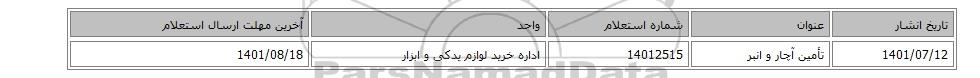 | 1401/07/12 | تأمین آچار و انبر | 14012515 | اداره خرید لوازم یدکی و ابزار | 1401/08/18 |