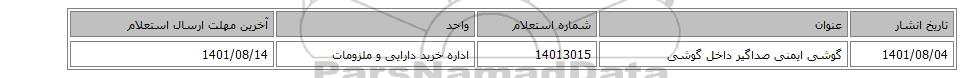 | 1401/08/04 | گوشی ایمنی صداگیر داخل گوشی | 14013015 | اداره خرید دارایی و ملزومات | 1401/08/14 |