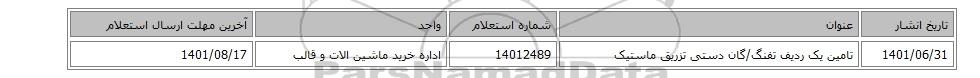 1401/06/31تامین یک ردیف تفنگ/گان ‎دستی‏ ‎تزریق ماستیک14012489اداره خرید ماشین الات و قالب1401/08/17