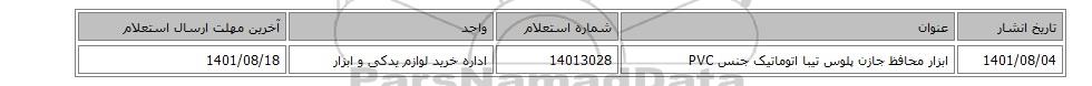 1401/08/04ابزار ‎محافظ جازن پلوس‏ ‎تیبا اتوماتیک‏ جنس ‎PVC‏14013028اداره خرید لوازم یدکی و ابزار1401/08/18