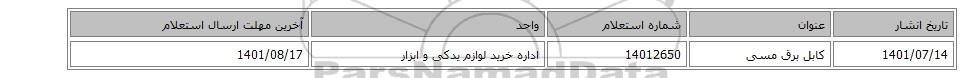 | 1401/07/14 | کابل برق مسی | 14012650 | اداره خرید لوازم یدکی و ابزار | 1401/08/17 |