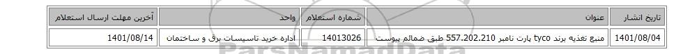 | 1401/08/04 | منبع تغذیه برند tyco پارت نامبر 557.202.210 طبق ضمائم پیوست | 14013026 | اداره خرید تاسیسات برق و ساختمان | 1401/08/14 |