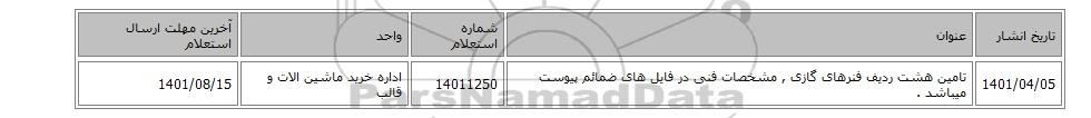 1401/04/05تامین هشت ردیف فنرهای گازی , مشخصات فنی در فایل های ضمائم پیوست میباشد .14011250اداره خرید ماشین الات و قالب1401/08/15