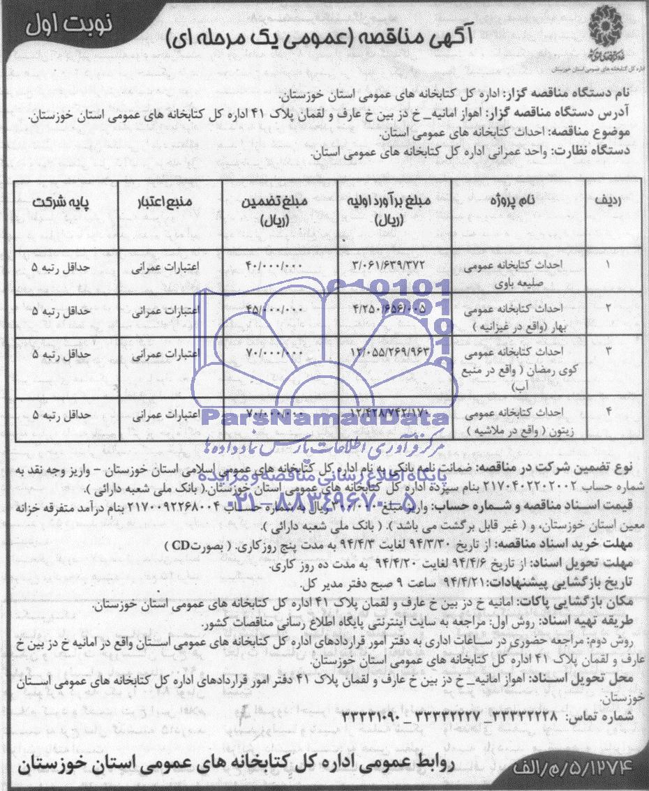 آدرس دستگاه مناقصه گذار: اهواز- امانیه، خ دز بین عارف و لقمان پلاک 41 اداره کل کتابخانه های عمومی استان خوزستان