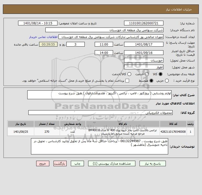 شرح کلی نیاز: لوازم روشنایی ( پروژکتور ، لامپ ، ترانس ، اگنیتور ، هلدورفشارقوی ) طبق شرح پیوست