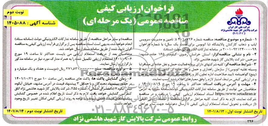 1- شماره و موضوع مناقصه: مناقصه شماره 4010726 (تامین و مدیریت سرویس ایاب و ذهاب کارکنان پالایشگاه (با اتوبوس برای مدت یک سال) با شماره فراخوان 2001092134000099 در سامانه تدارکات الکترونیکی دولت ستاد