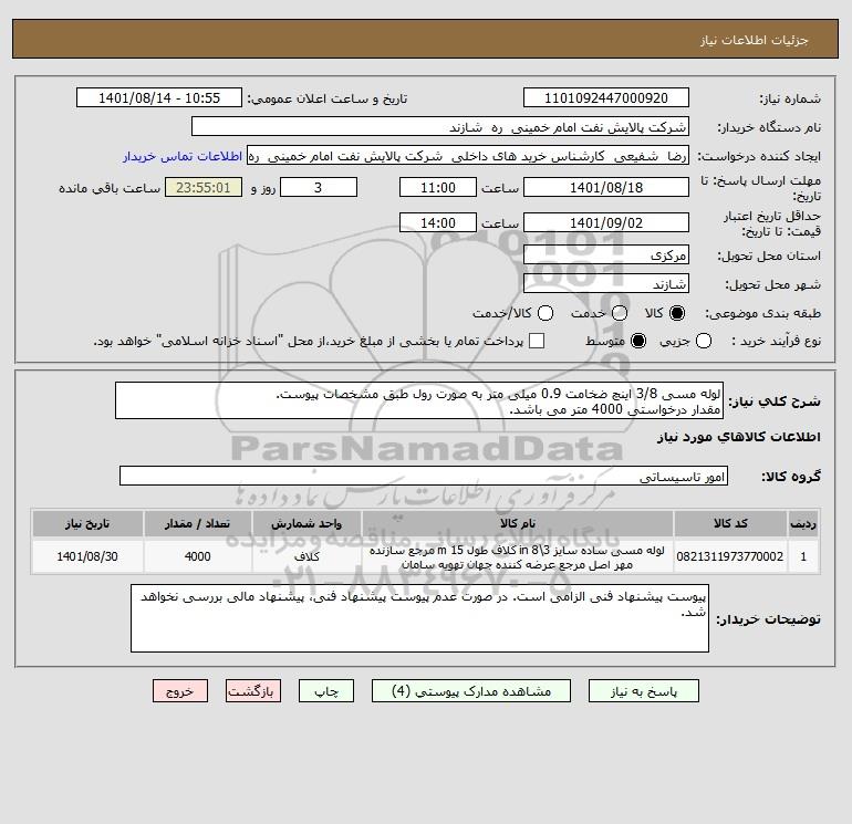 شرح کلی نیاز: لوله مسی 3/8 اینچ ضخامت 0.9 میلی متر به صورت رول طبق مشخصات پیوست. مقدار درخواستی 4000 متر می باشد.