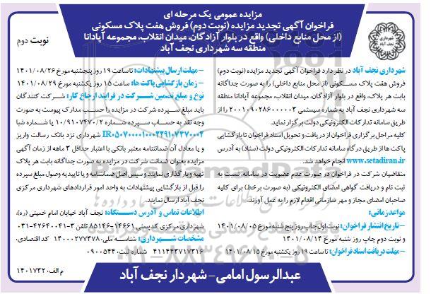 فراخوان آگهی تجدید مزایده (نوبت دوم) فروش هفت پلاک مسکونی واقع در بلوار آزادگان، میدان انقلاب، مجموعه آپادانا منطقه سه شهرداری نجف آباد