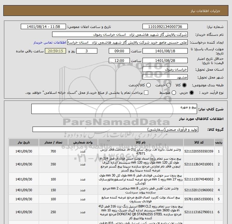 نام دستگاه خریدار:شرکت پالایش گاز شهید هاشمی نژاد استان خراسان رضوی