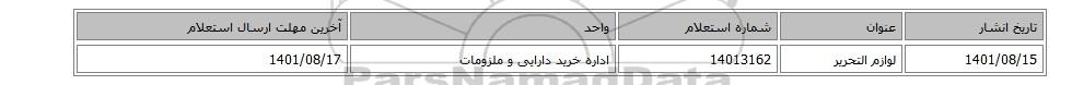 | 1401/08/15 | لوازم التحریر | 14013162 | اداره خرید دارایی و ملزومات | 1401/08/17 |