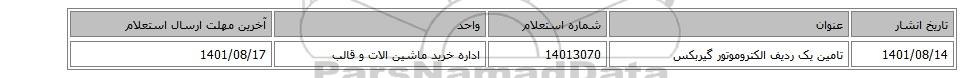 | 1401/08/14 | تامین یک ردیف الکتروموتور گیربکس | 14013070 | اداره خرید ماشین الات و قالب | 1401/08/17 |
