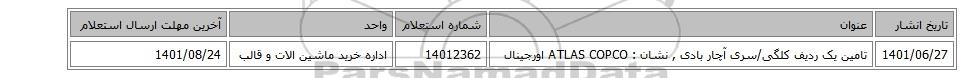 1401/06/27تامین یک ردیف کلگی/سری آچار بادی , نشان : ATLAS COPCO اورجینال14012362اداره خرید ماشین الات و قالب1401/08/24