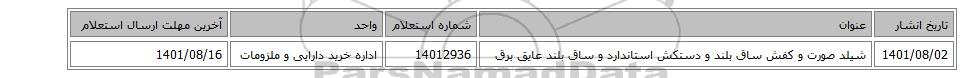 استعلام بها و موضوع استعلام شیلد صورت و کفش ساق بلند و دستکش استاندارد و ساق بلند عایق برق به اطلاع کلیه شرکتها و افراد متخصص واجد شرایط میرساند، آگهی گذار در نظر دارد از طریق استعلام بها، نسبت به انتخاب و دریافت پیشنهادات اقدام نماید. این استعلام با کد آگهی ثبت شده در سامانه خبرگزاری پارس نماد : 5110522 منتشر شده است. مشخصات استعلام : تاریخ شروع استعلام: 1401/08/15 آخرین مهلت ارسال پیشنهاد قیمت : 1401/08/16 و محل اجرای پروژه : استان تهران میباشد. استعلام قیمت مورد درخواست : شیلد صورت و کفش ساق بلند و دستکش استاندارد و ساق بلند عایق برق با دستهبندیهای تخصصی و گروه های مرتبط : البسه و پوشاک, سیستم ایمنی ، اتش نشانی،اعلام و اطفای حریق, کفش, استعلام اطلاع رسانی میگردد.