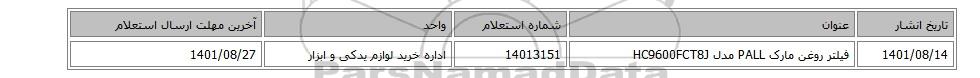| 1401/08/14 | فیلتر روغن مارک PALL مدل HC9600FCT8J | 14013151 | اداره خرید لوازم یدکی و ابزار | 1401/08/27 |