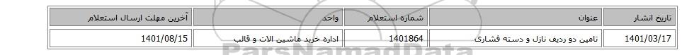 1401/03/17تامین دو ردیف نازل و دسته فشاری1401864اداره خرید ماشین الات و قالب1401/08/15