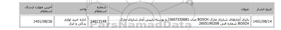 | 1401/08/14 | باتری آچارهای شارژی مارک BOSCH مدل 2607335681/ و پوسته پایینی آچار شارژی مارک BOSCH شماره فنی 2605190208 | 14013148 | اداره خرید لوازم یدکی و ابزار | 1401/08/26 |