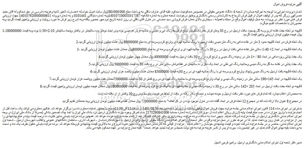 شماره پرونده اجرایی:با توجه به اجرائیه صادره از شعبه 4 دادگاه عمومی حقوقی در خصوص محکومیت محکوم علیه اقای عارف ناقلی به پرداخت مبلغ 580/000/000ریال بابت اصل خواسته +خسارت تاخیر تادیه وهزینه دادرسی در حق محکوم له اقای حمید نصرالهی زرگر که پس از توقیف اموال از قبیل فرش ئارجاع به کارشناس رسمی دادگستری وطبق درخواست شعبه محترم به شماره ابلاغیه 140107100010317387وبه شماره بایگانی 0101441 و به شماره پرونده 140107920000000611 جهت ارزیابی فرش های مورد نظر در پرونده ،به محل توقیف اموال واقع در محله باغمیشه ، سیمتری بالای مغازه فرش فروشی سید محسنی ،در منزل اقای ناقلی در روز شنبه تاریخ دوم مهر حضور یافته وبه شرح زیر فرش ها مورد روئیت و ارزیابی وتعیین قیمت گردید وبه حضورتان با مشخصات تقدیم میگردد