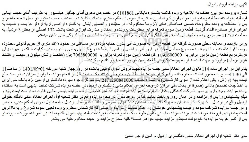 شماره پرونده اجرایی: عطف به ابلاغیه پرونده کلاسه بشماره بایگانی 0101861 در خصوص دعوی آقای چنگیز عباسپور  به طرفیت آقای حجت ایمانی قره قیه بخواسته: مطالبه وجه و در اجرای قرار کارشناسی صادره از سوی آن مقام محترم، اینجانب کارشناس منتخب حسب دستور در محل شعبه حاضر و پس از مطالعه پرونده مطروحه، ضمن هماهنگی های لازم با محکوم له ، در معیّت و راهنمایی ایشان  به گستره اراضی قریه قره لر عزیمت و نسبت به اجرای قرار صادره اقدام گردید. قطعه زمین مورد تعرفه برابر محتویات پرونده و اسناد و مدارک ابرازی تحت پلاک 132 اصلی از بخش 3 اردبیل به مساحت 11773 مترمربع بوده وتطبیق این قطعه زمین با کروکی ثبتی و جانمایی در طبیعت مطلقت آن را با کروکی ثبتی نشان میدهد.