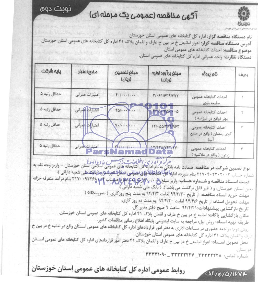 آدرس دستگاه مناقصه گذار: اهواز- امانیه، خ دز بین عارف و لقمان پلاک 41 اداره کل کتابخانه های عمومی استان خوزستان