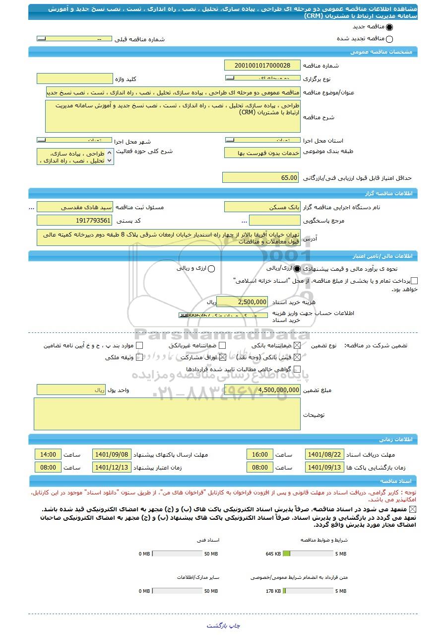 عنوان/موضوع مناقصهمناقصه عمومی دو مرحله ای طراحی ، پیاده سازی، تحلیل ، نصب ، راه اندازی ، تست ، نصب نسخ جدید و آموزش سامانه مدیریت ارتباط با مشتریان (CRM)