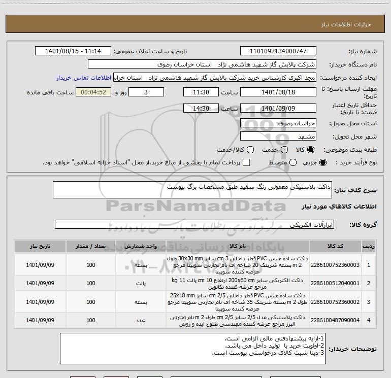 استعلام داکت پلاستیکی معمولی رنگ سفید طبق مشخصات برگ پیوست, استعلام داکت پلاستیکی معمولی رنگ سفید طبق مشخصات برگ پیوست