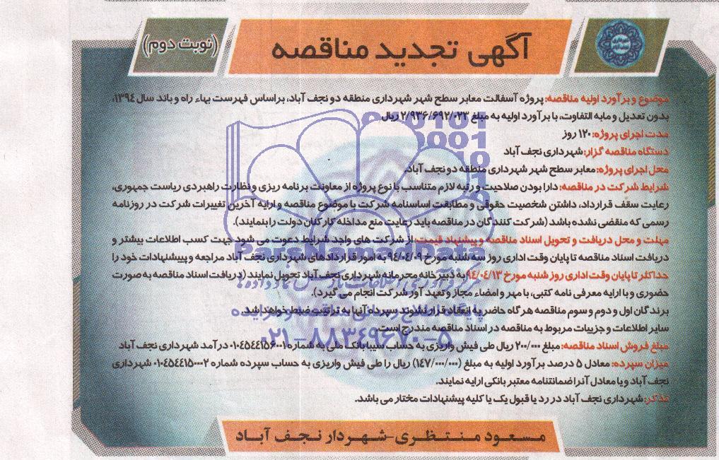 موضوع و برآورد اولیه مناقصه: پروژه آسفالت معابر سطح شهر شهرداری منطقه دو نجف آباد بر اساس فهرست بها راه و باند سال 94 بدون تعدیل و مابه التفاوت با برآورد اولیه به مبلغ 2.936.692.023 ریال