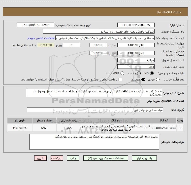 شرح کلی نیاز: قند شکسته مرغوب مقدار6460 گیلو گرم در بسته بندی دو کیلو گرمی با احتساب هزینه حمل وتحویل در پالایشگاه