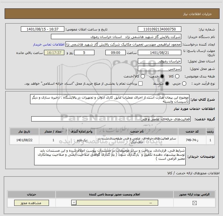 نام دستگاه خریدار:شرکت پالایش گاز شهید هاشمی نژاد استان خراسان رضوی