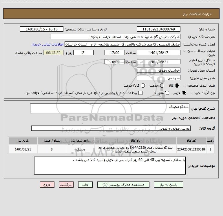 نام دستگاه خریدار:شرکت پالایش گاز شهید هاشمی نژاد استان خراسان رضوی