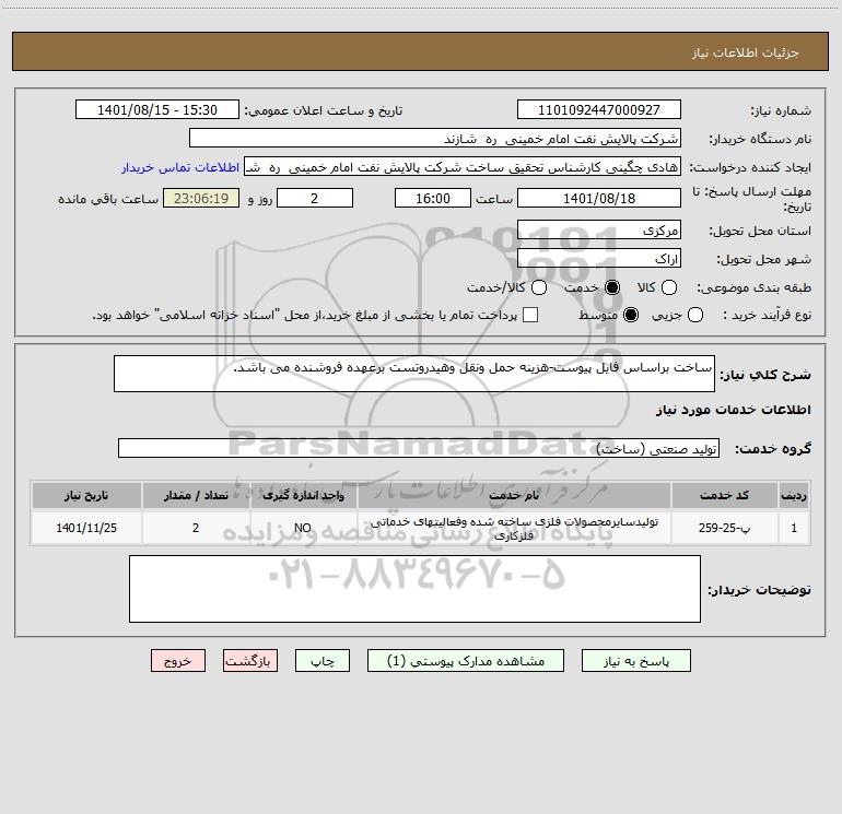 شرح کلی نیاز: ساخت براساس فایل پیوست-هزینه حمل ونقل وهیدروتست برعهده فروشنده می باشد.