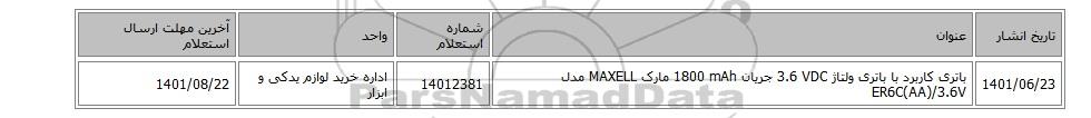 استعلام، باتری کاربرد ‎با باتری‏ ولتاژ ‎3.6 VDC‏ جریان ‎1800 mAh‏ مارک MAXELL‎ مدل ‎ER6C(AA)/3.6V, باتری کاربرد ‎با باتری‏ ولتاژ ‎3.6 VDC‏ جریان ‎1800 mAh‏ مارک MAXELL‎ مدل ‎ER6C(AA)/3.6V