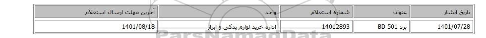 | 1401/07/28 | برد BD 501 | 14012893 | اداره خرید لوازم یدکی و ابزار | 1401/08/18 |