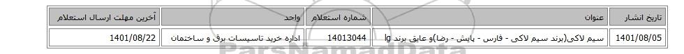 | 1401/08/05 | سیم لاکی(برند سیم لاکی - فارس - پایش - رضا)و عایق برند lg | 14013044 | اداره خرید تاسیسات برق و ساختمان | 1401/08/22 |