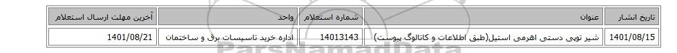 1401/08/15شیر توپی دستی اهرمی استیل(طبق اطلاعات و کاتالوگ پیوست)14013143اداره خرید تاسیسات برق و ساختمان1401/08/21