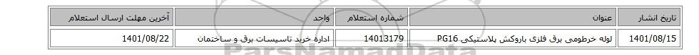 1401/08/15لوله خرطومی برق فلزی باروکش پلاستیکی PG1614013179اداره خرید تاسیسات برق و ساختمان1401/08/22