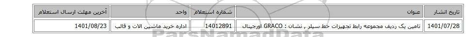 | 1401/07/28 | تامین یک ردیف مجموعه رابط تجهیزات خط سیلر , نشان : GRACO اورجینال | 14012891 | اداره خرید ماشین الات و قالب | 1401/08/23 |