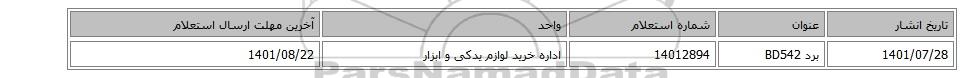 | 1401/07/28 | برد BD542 | 14012894 | اداره خرید لوازم یدکی و ابزار | 1401/08/22 |