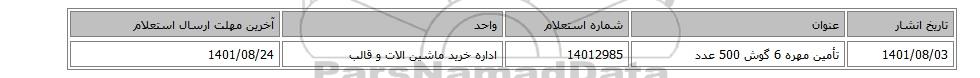 | 1401/08/03 | تأمین مهره 6 گوش 500 عدد | 14012985 | اداره خرید ماشین الات و قالب | 1401/08/24 |